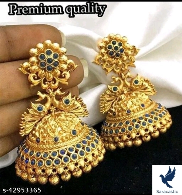 Latest Earrings & Studs Base Metal: Alloy Plating: Gold Plated - Matte Sizing: Non-Adjustable Stone Type: Ruby Type: Jhumkhas Multipack: 1 Very glamourous and delegant big south jhumka famous for style and peacock design.. Country of Origin: India